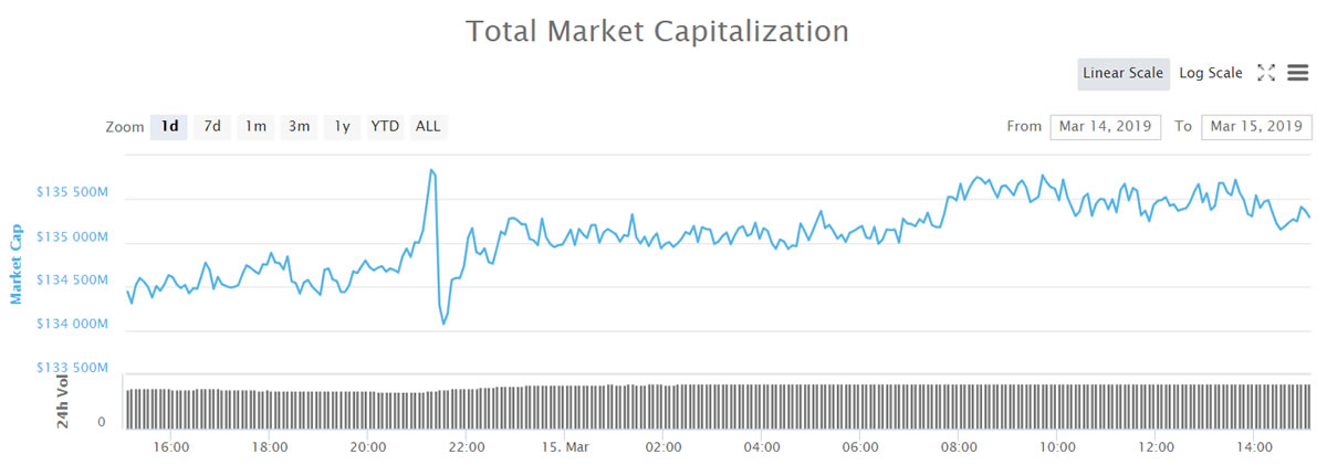 Crypto markets are still consolidating as we round off another week. Volume has crept up a little and a slow uptrend has formed over the past couple of days as major crypto assets hit resistance levels. Total market capitalization has made it over $135 billion for the past few hours.