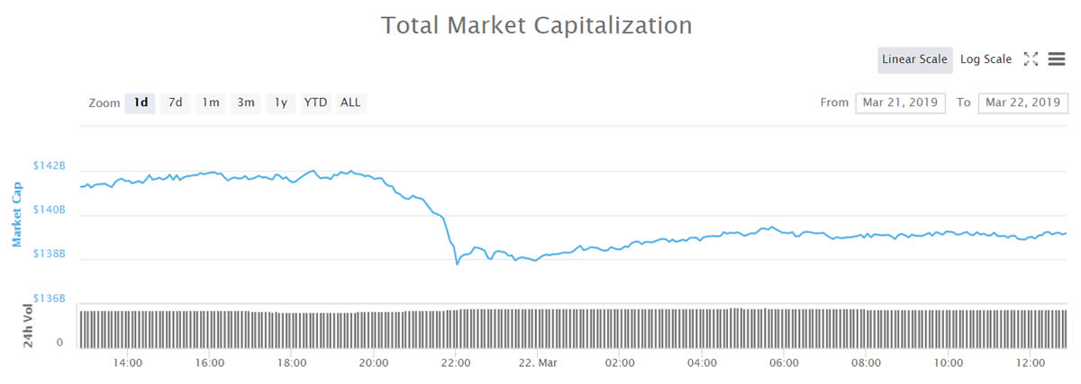 There has been some movement in crypto markets over the past 24 hours but unfortunately it has been in the downward direction. Red dominates the charts at the moment and total market capitalization has fallen back below $140 billion after reaching a .