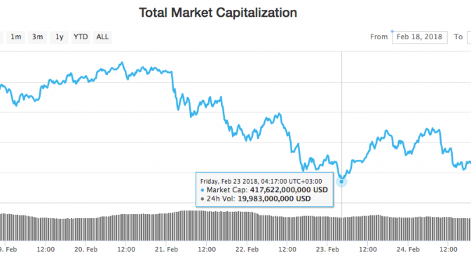 Total market cap is almost $420 bln by press time, down from the intra-week high of , but higher than the intra-week low thus far of around $417 bln.
