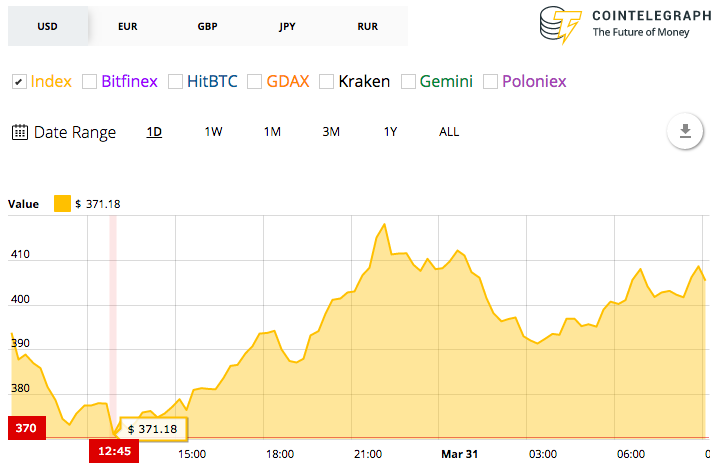 (ETH) is also in the green, up almost 3 percent over a 24 hour period and trading at around $406 by press time, up from a 24-hour low of $371.