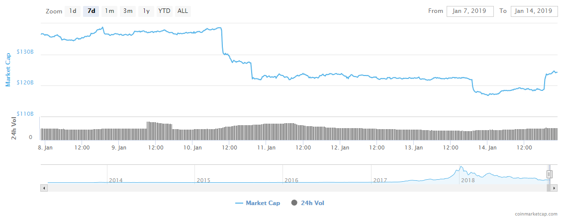 The total market capitalization of all digital currencies is at around at press time, having started the day at $117.9 billion. The weekly high of the metric was around $138.7 billion on Jan. 8, according to CoinMarketCap data.