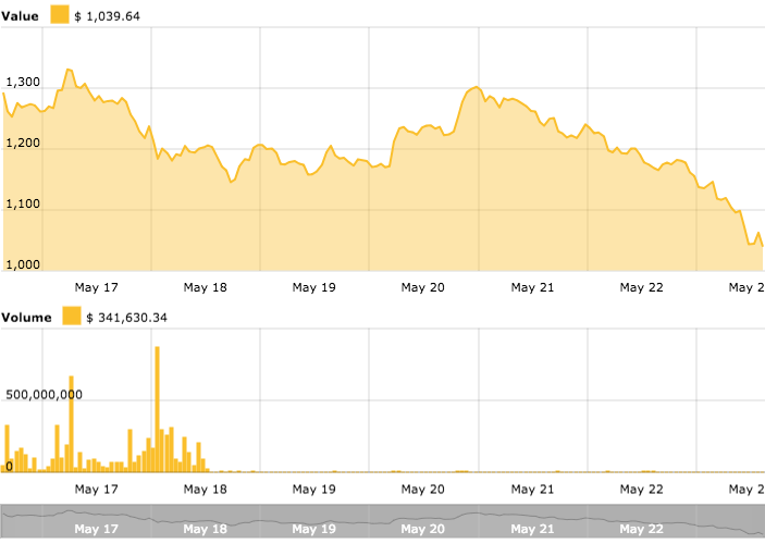 (ETH) has seen a loss of almost 10 percent over the 24 hour period, trading at to press time. The dip brings the altcoin’s monthly value change into the negative, threatening to what had been astonishing monthly gains of over 100 percent in early May.