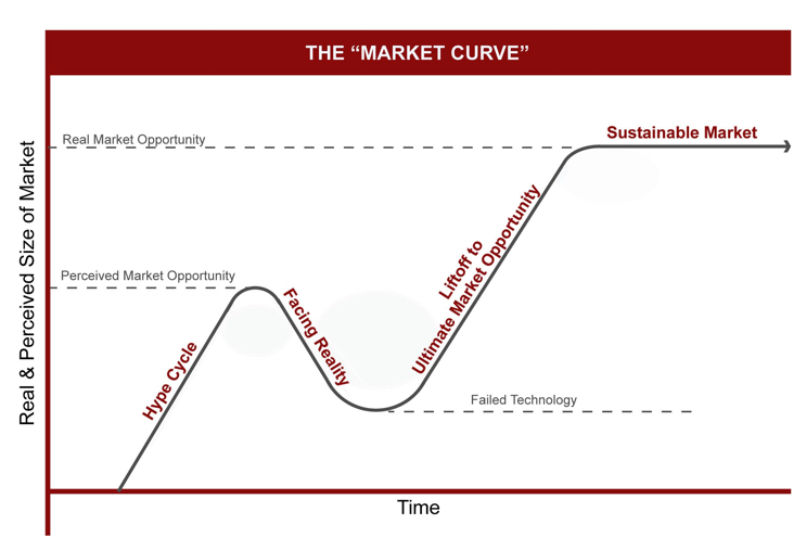 First, there must be broad adoption of core underlying technologies that support the market. Second, there needs to be compelling reference applications to drive mainstream adoption. Finally, there must be a pioneering company, typically with a charismatic leader, that leads the market out of the trough.