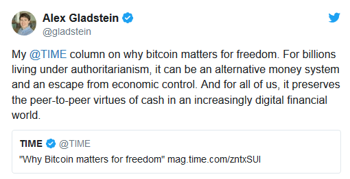 Emanuel’s statement at the FinTech event echoed the views presented by humans right advocate, Alex Gladstein. Gladstein had previous written Op-Eds and tweeted about how bitcoin mattered in terms of financial freedom, and was an “escape from economic control.”