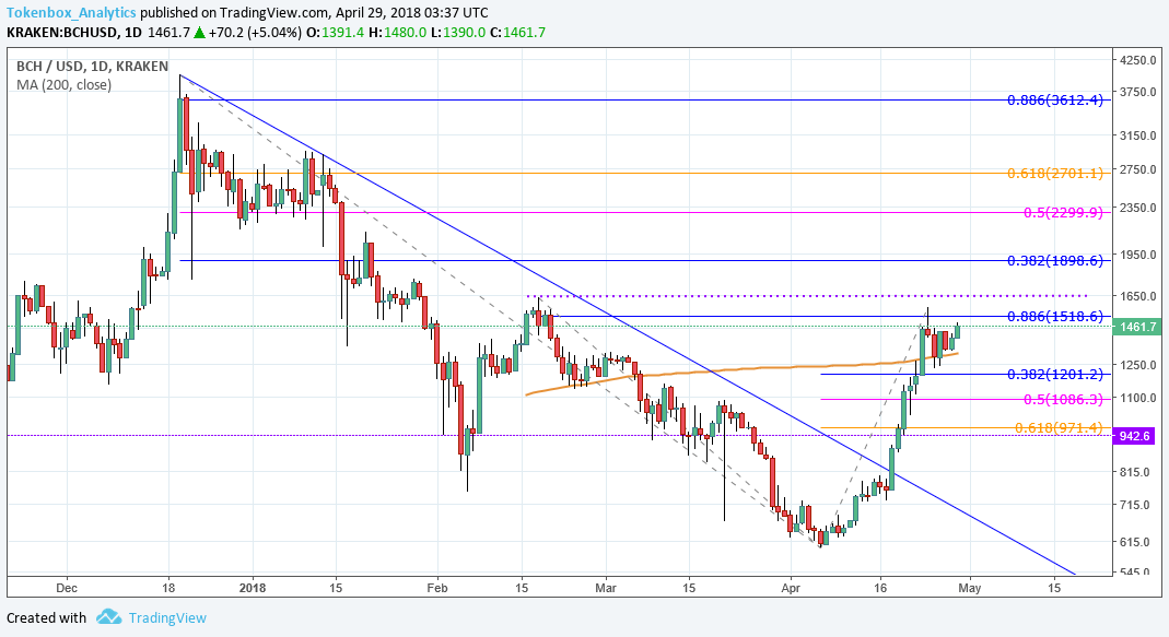 bitcoin Cash shows similar relative strength in that it moved above its 200-day line (brown) last week and has recognized it as support since. Leading the way, the had one of the strongest moves off the bottom, rising 162.3% as of last week’s high of $1,573 in four weeks.