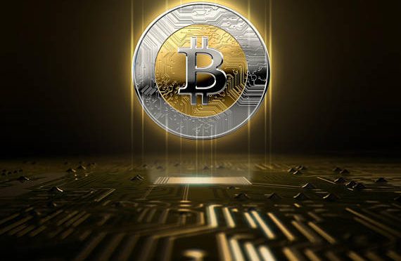 A cryptocurrency bitcoin hologram in gold and silver physical coin form hovvering over a computer circuit board