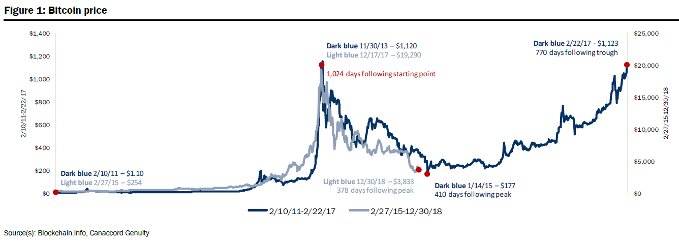 In his “bitcoin Monthly” report for January, Graham pointed out that bitcoin’s price movements over the last three years were very similar to their movements between 2011 and 2014. He noted that it took a little more than 1,000 days for the bitcoin price to peak, and then it bottomed out about 400 days later after declining by about 80%.