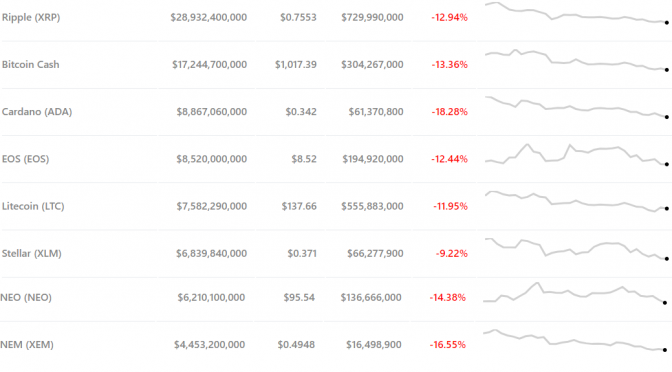 Both the Ripple price and bitcoin Cash price declined by 13 percent, reducing the third- and fourth-largest cryptocurrencies to present values of $0.75 and $1,017, respectively.