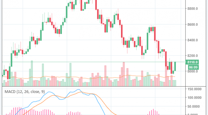 bitcoin has demonstrated a similar trend as Ether, dipping below $8,000 and falling to $7,950. Although it has gained back some of its losses, like Ether, it is testing the $8,000 region. bitcoin also has low daily trading volume across major exchanges and thus, unless a short-term recovery is made, it is likely that the price of bitcoin will remain in the $8,100 region over the next 24 hours.