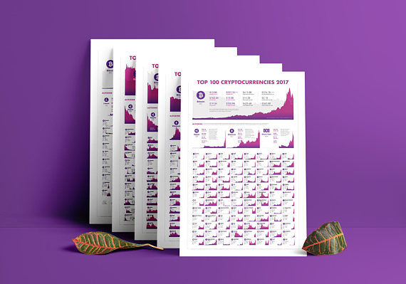 This is a must-have poster collection for any crypto currency enthusiast. These 5 infographic posters (measuring 24 x 36 inches) each show a historical snapshot of the top crypto currencies in 2017, 2016, 2015, 2014 and 2013.