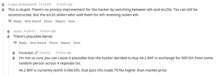 “It’s dumb but a lot safer than using those dogy tumbler services. And I think the hacker is betting on the fact that courts and law enforcement are largely still completely clueless regarding cryptocurrency and might actually fall for it. Also they might do other things, maybe that’s only the first step.”