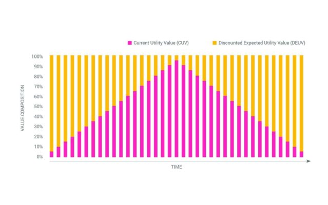 2) seinem diskontierten erwarteten Nutzwert (Discounted Expected Utility Value = DEUV), auch manchmal als „spekulativer Wert“ bezeichnet.