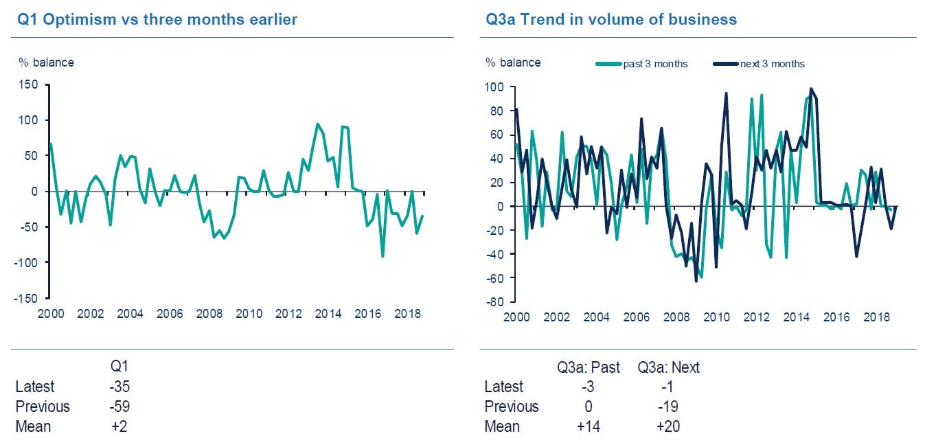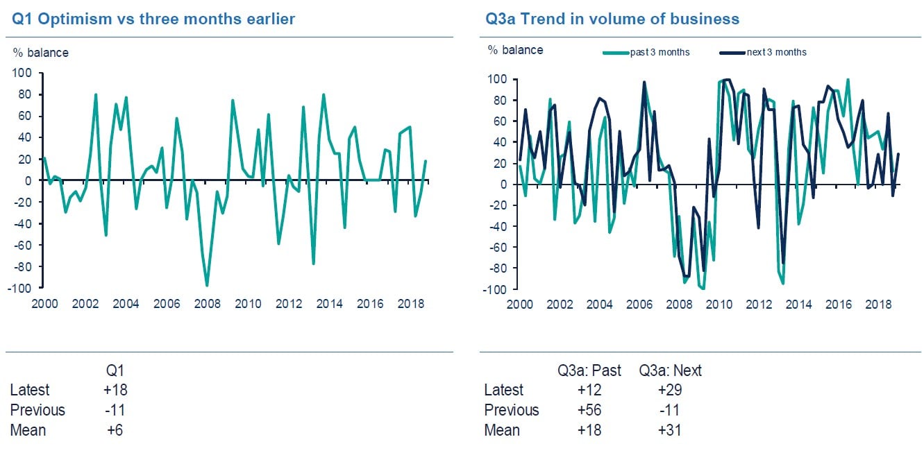 - 24% of firms said that business volumes were up, while 32% said they were down, giving a balance of -7% (down from +12% in the quarter to September)