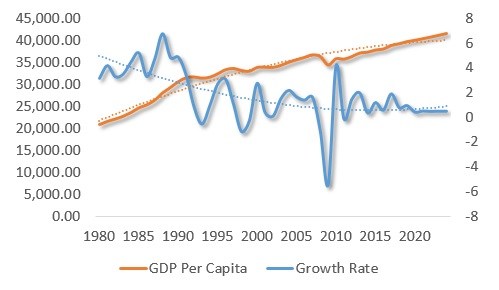 In the past three decades, Japanese living standard has increased from over $30,000 to nearly $45,000. Yet, Japan’s trend growth has plunged from 5 percent to less than 0.5 percent – over 90 percent (Figure).
