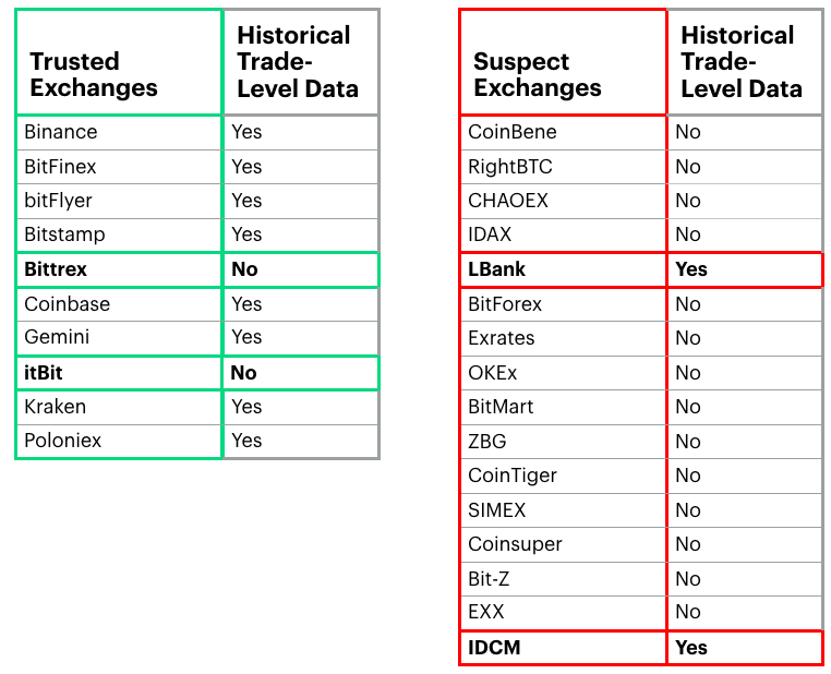 In contrast, we found that every single one of the exchanges explicitly called out by Bitwise as bad actors provides limited trading history and virtually no granularity around trading activity.