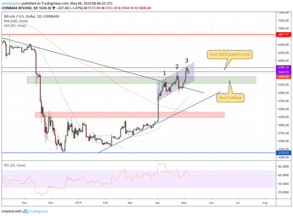 As in one of our analysis, the bitcoin price is facing a psychological resistance in $5,660-5,787 area, which served as an active support area in June 2018. The latest price action further reveals the presence of an . Its upper line lately coincided with the $5,787 resistance level. The said line also served as a crucial resistance on two separate occasions, as indicated by ‘1’ and ‘2’ in the chart above. That, at least, confirmed the role these indicators are playing in the current market scenario.