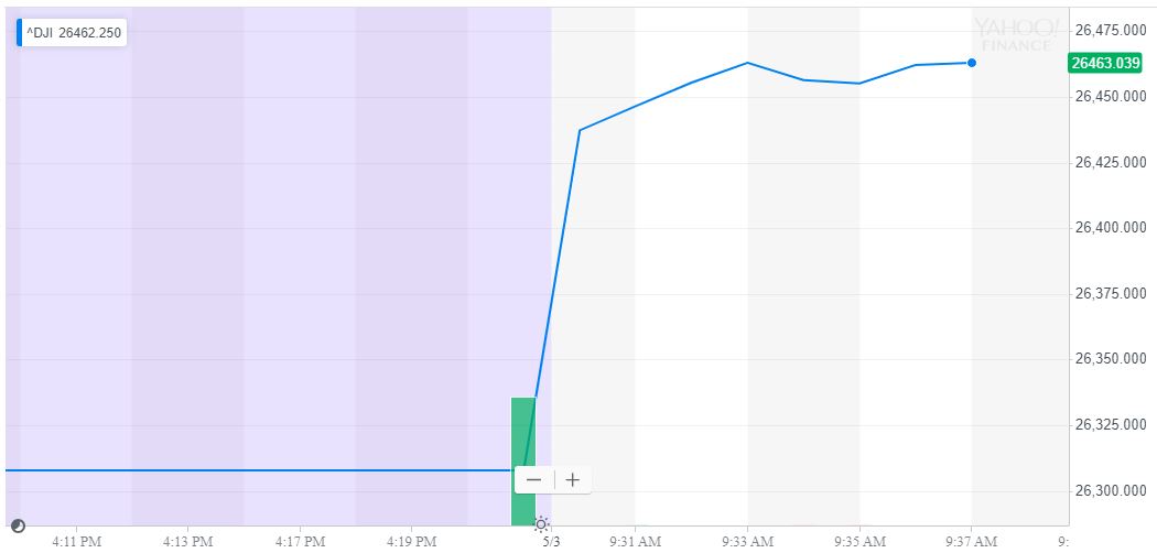 As of 9:38 am ET, the had jumped 152.61 points or 0.58%, launching the DJIA to 26,460.4. The S&P 500 and Nasdaq posted similar gains, rising 0.55% to 2,933.65 and 0.67% to 8,090.68.