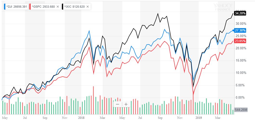 The Dow (blue), S&P 500 (red), and Nasdaq (black) have all boomed throughout Trump’s presidency. As the stock market hits new highs, he’s incensed that the media won’t credit him with spurring Wall Street’s bull run. | Source: Yahoo Finance