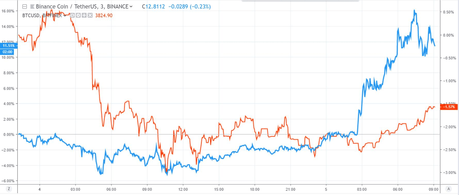 Binance coin’s phenomenal rally might have contributed to bitcoin’s moderate bump. | Source: Mati Greenspan/TradingView