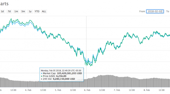While (BTC) had on Feb. 5 when the Dow Jones had dropped about 1,100 points, bitcoin is now trading at around according to Coin Market Cap, up 6.08% over a 24-hour period by press time.