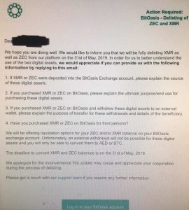 “@bitoasis its not possible to reply to your email about delisting ZEC and XMR.