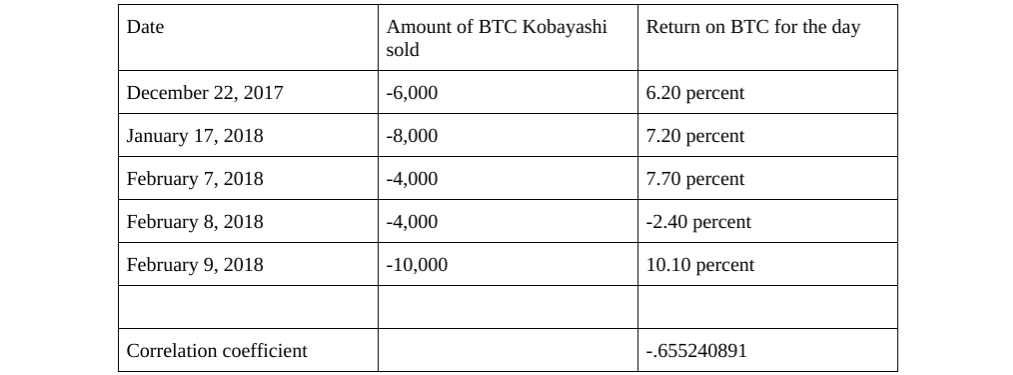 The correlation between Kobayashi selling bitcoin and the return on bitcoin for the day is negatively correlated at -.655240891. This means that the movements in the price of bitcoin and the amount of coins that Kobayashi unloads on the market move independently of each other.