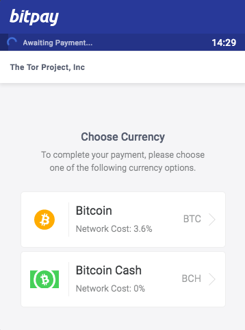 The anonymity-centric browser also includes a “bitcoin” donation option that confusingly gives the option of paying in both BTC and BCH: