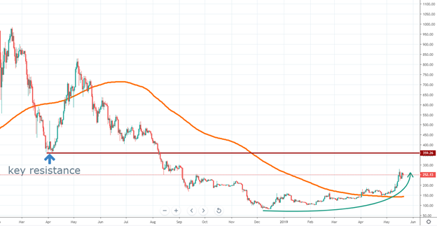 For the first time since April 2018, the price of Ether had broken above the on April 2nd this year, communicating the market entered a bullish territory. Since then, the price action continued to float above the moving average and if the parabolic structure will continue to extend higher, we believe there could be room for more gains towards the $360 key resistance area, where a previous 2018 low is located.