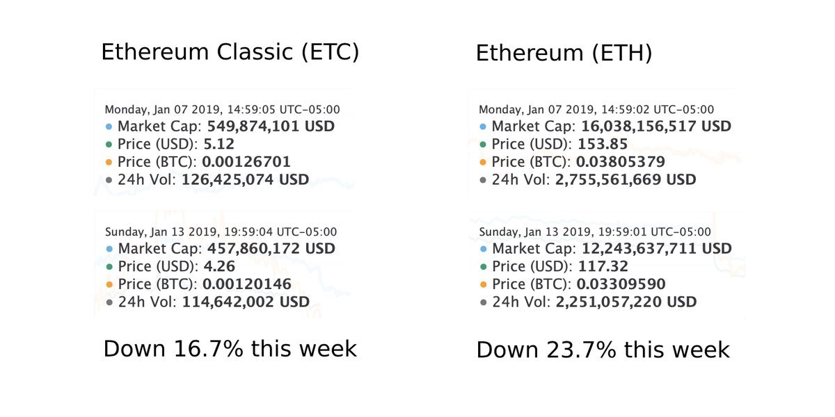 ETH, recorded a trading volume of $2.7 billion on January 7 after which it fell to $2.2 billion on January 13. The coin suffered a loss of 23.7% over the week, which is seven percent more than that of ETC. ETH suffered more loss in a week than ETC, even after being attacked and the transactions being halted for more than a day.