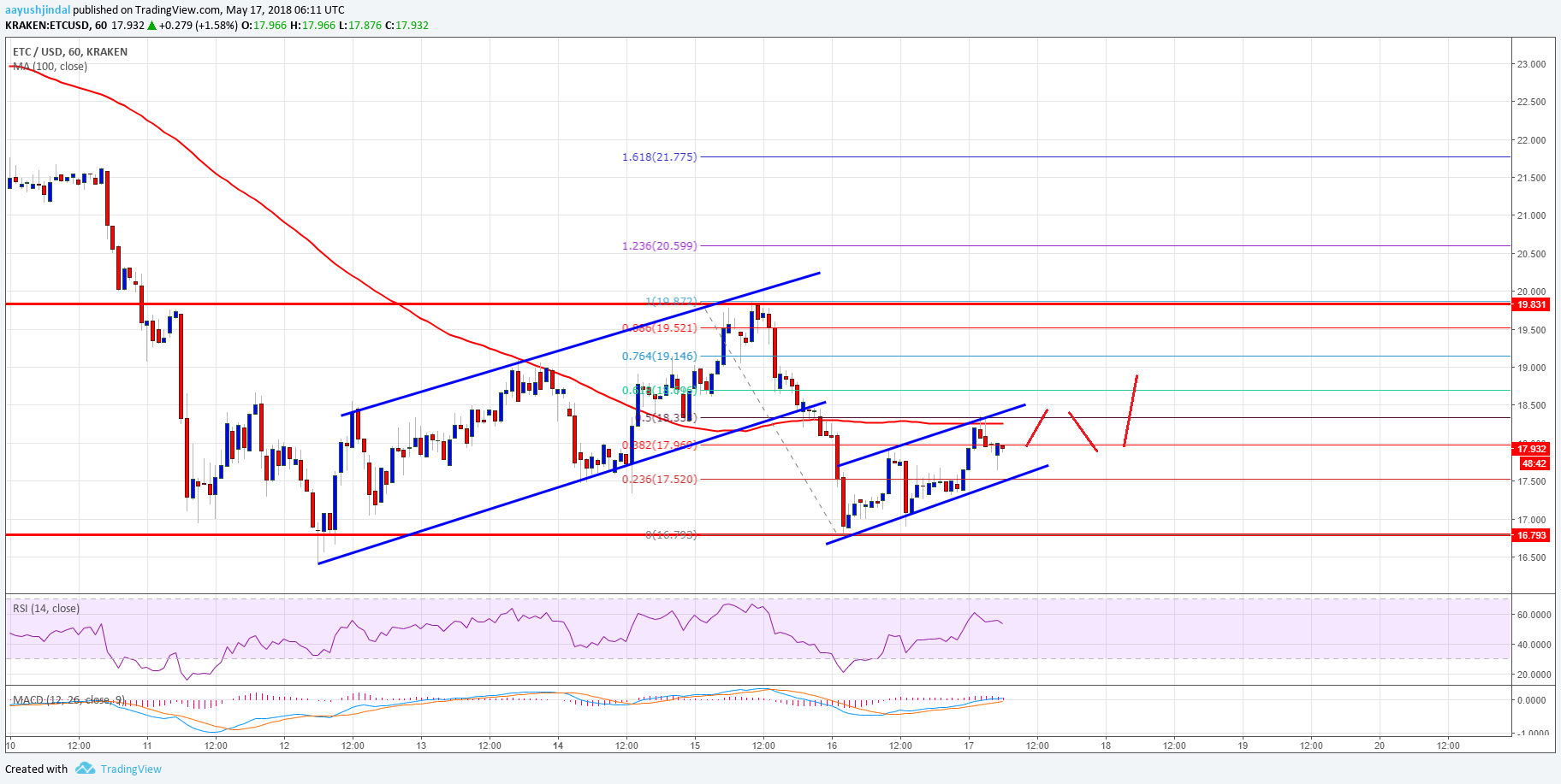 However, the upside move was capped by the $18.35 level and the 100 hourly simple moving average. There is also a short-term ascending channel forming with support at $17.50 on the hourly chart of the ETC/USD pair. The ascending channel pattern seems to be a replica of a previous pattern, which paved way for losses below $17.00. The current pattern if the price remains above $17.00. Buyers need to push the price above $18.35 and the 50% Fib retracement level of the last drop from the $19.87 high to $16.79 low.