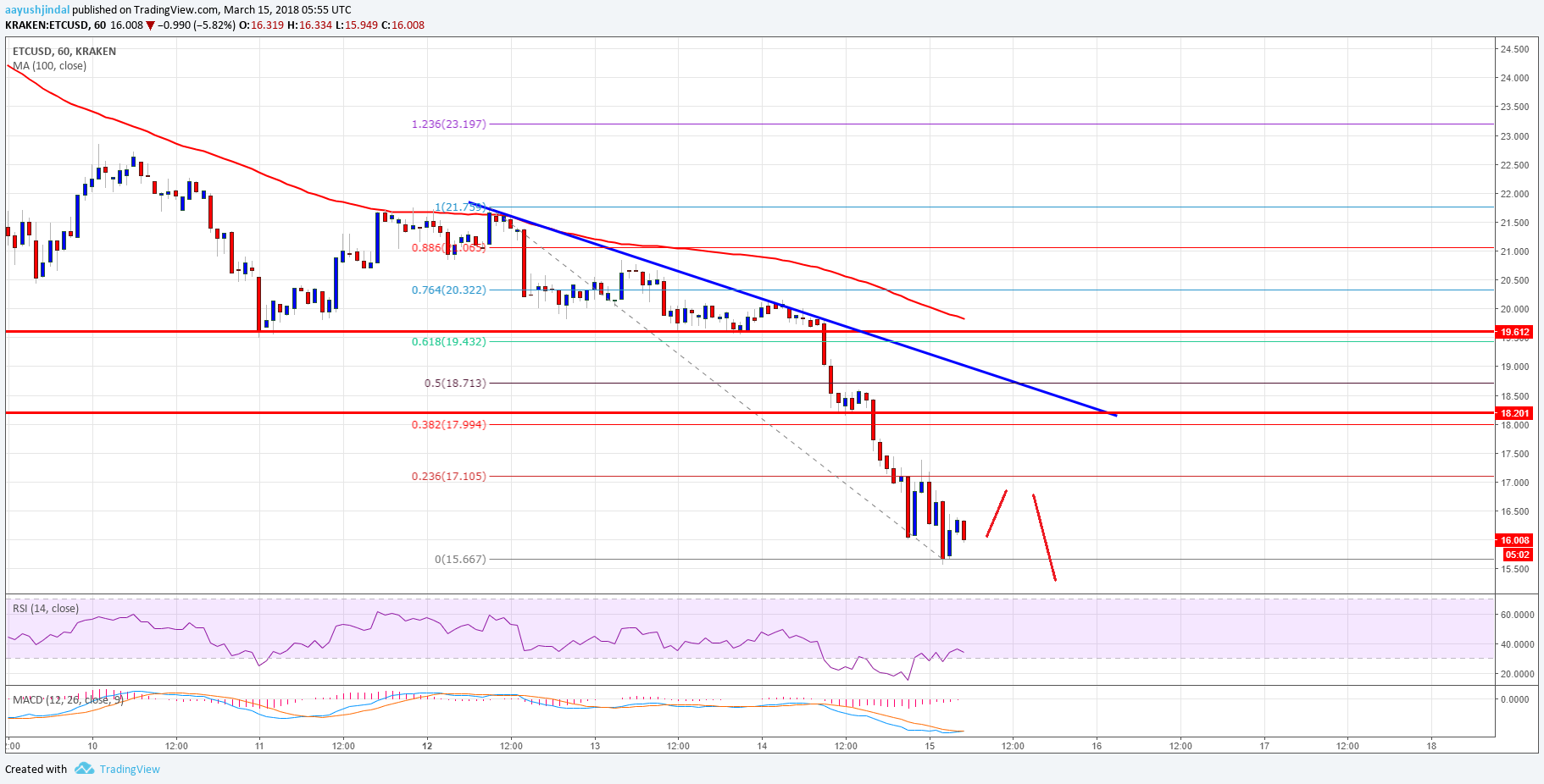 There was no upside move above $21.00 during the past few days in ETC price against the US dollar. The price started a downside move and . The downside move was strong as the price even failed to hold the $18.00 support level. It is now trading well below the $18.00 pivot level and the 100 hourly simple moving average.