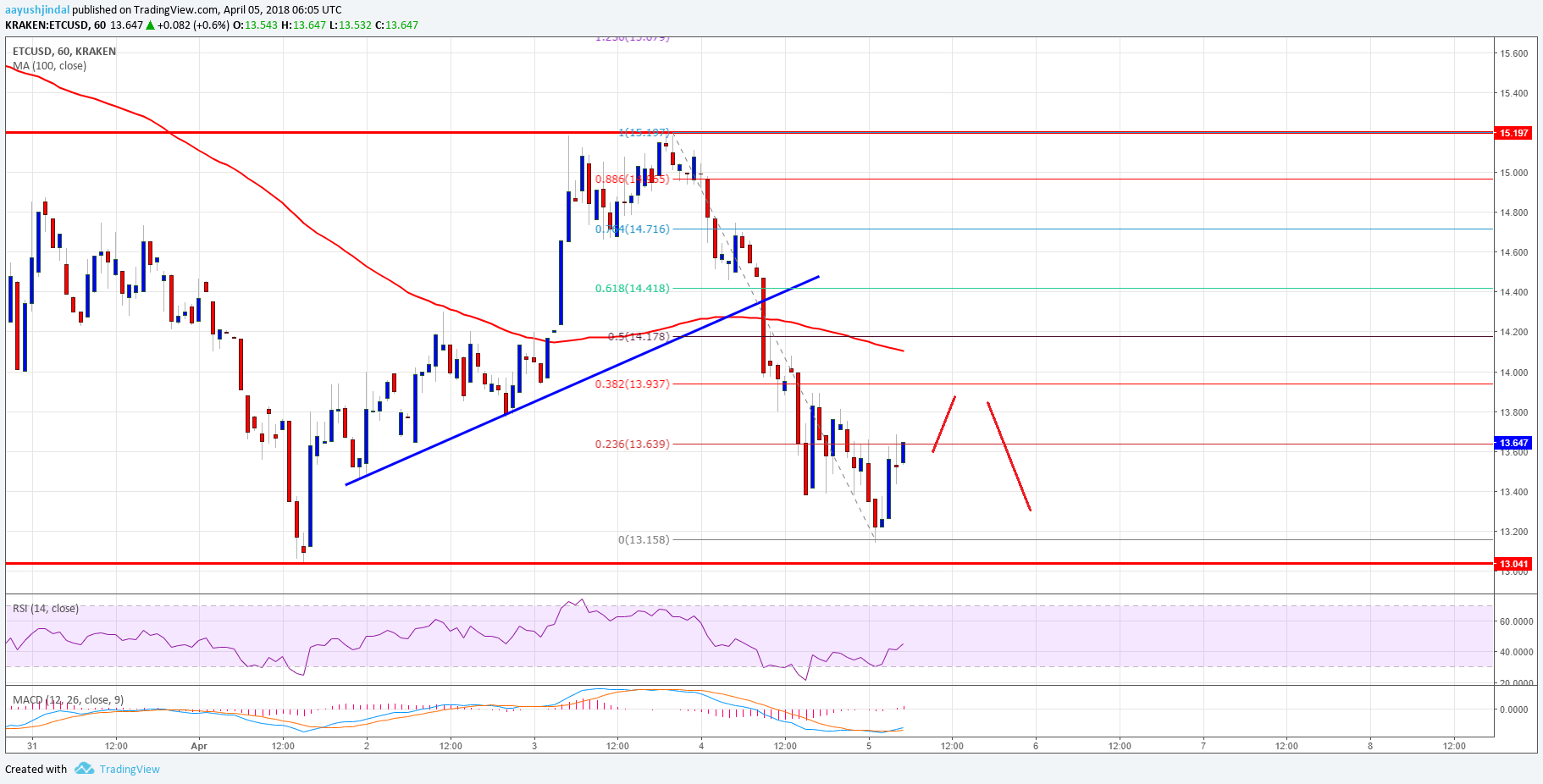 During the decline, there was also a break below a connecting bullish trend line with support at $14.30 on the hourly chart of the ETC/USD pair. The pair traded towards the $13.00 handle and formed a low at $13.15. At the moment, the price is recovering and testing the 23.6% Fib retracement level of the last decline from the $15.19 high to $13.15 low. However, there are on the upside near the $14.50 level. The 100 hourly SMA is positioned near 50% Fib retracement level of the last decline from the $15.19 high to $13.15 low.