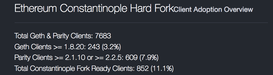 “Ethereum Constantinople Client Adoption Coverage: 10.2% – Upgrade your clients as soon as possible! – Geth 1.8.20 – Parity Ethereum 2.1.10 or 2.2.5”