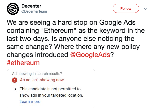 The team also stated that Google Ads team claim that there have not been any changes to their cryptocurrency advertisement policy. Despite the claims made by the tech giant, ads related to Ethereum are not being displayed on the search engine platform since January 8, 2019, Decenter added.