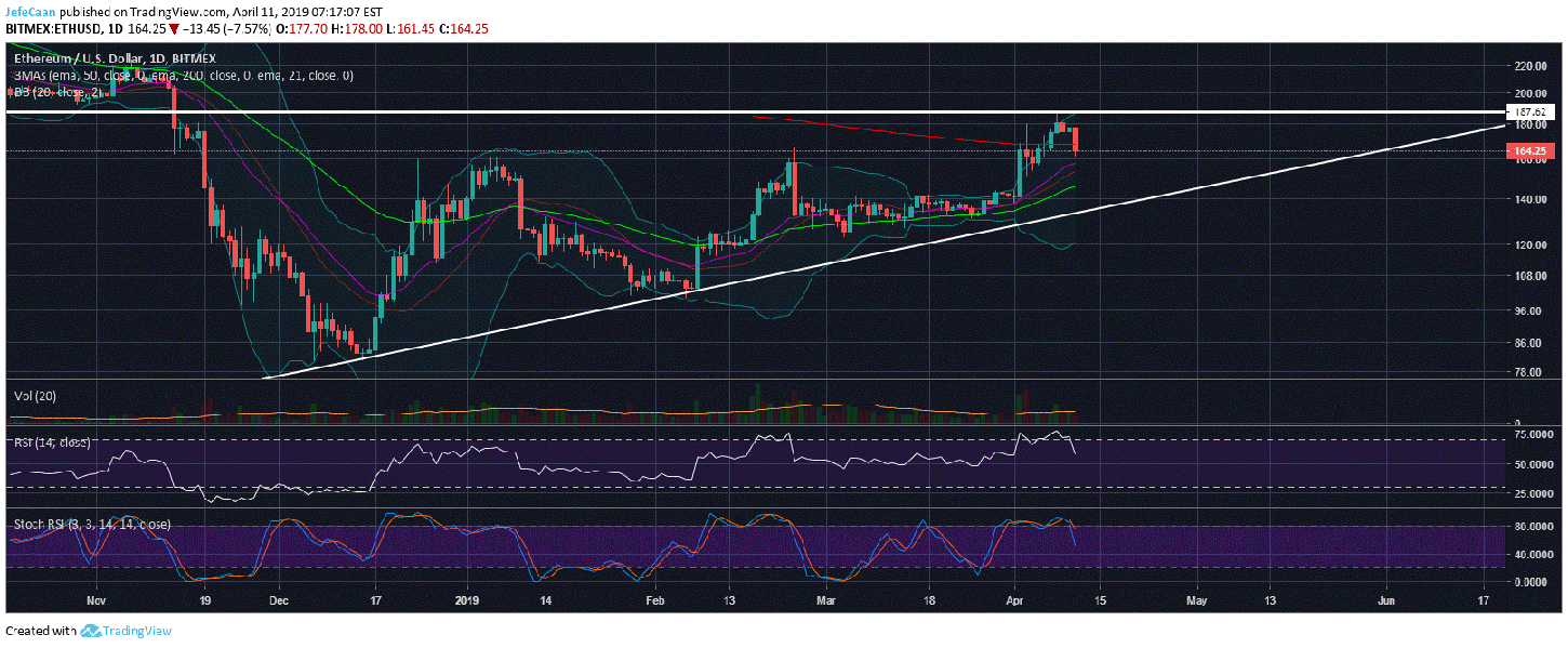 The 1H chart for shows that the majority expected the price to break to the upside which it did but it was a fake out. It was soon followed by a break below the ascending triangle that inflicted maximum on overly bullish traders who entered aggressive long positions despite the price being massively overbought on most time frames. The Bollinger bands on the hourly chart now point to a swift recovery to the upside towards the end of the week. The S&P 500 has also been stalling a move to the downside and has still some room to move up. This is why we expect ETH/USD to rally higher from here in the days ahead. The price may find it difficult to breach the previous resistance around $187 but considering that the RSI has now cooled off significantly on the daily time frame, the probability of a move towards $200 has increased.