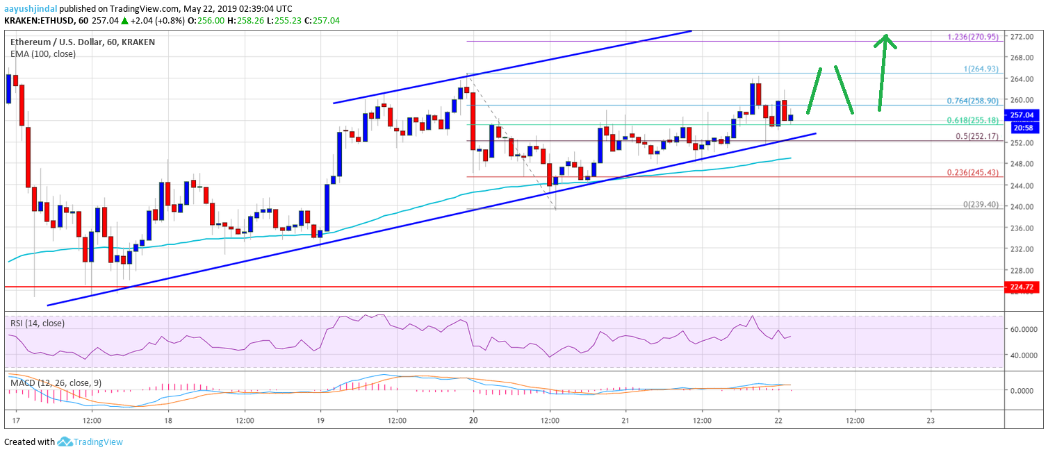 In the past few sessions, Ethereum price slowly moved higher from the $239 swing low against the US Dollar. The ETH/USD pair broke the $245 resistance level and settled above 100 hourly simple moving average. The recent rise was positive as there was a break above the 50% Fib retracement level of the last decline from the $265 high to $239 low. The price even broke the $255 resistance area and tagged the $263 level.