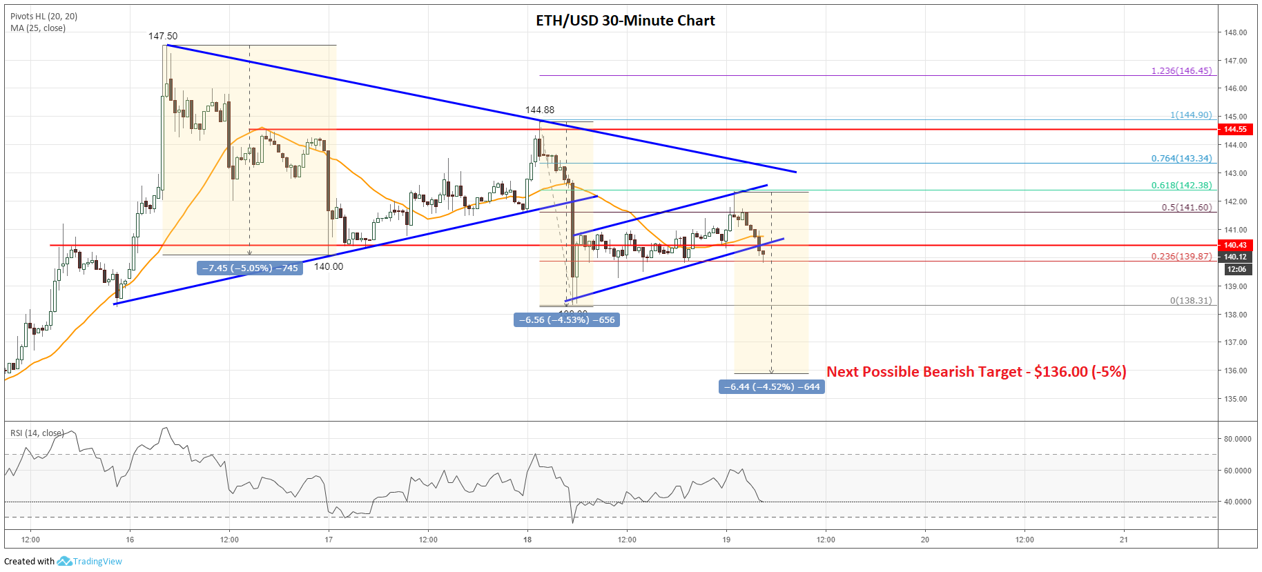 Looking at the 30-minute of ETH/USD, the pair traded as high as $144.88 and later declined sharply. It broke the $142.00 support area and a connecting bullish trend line to move into a bearish zone.