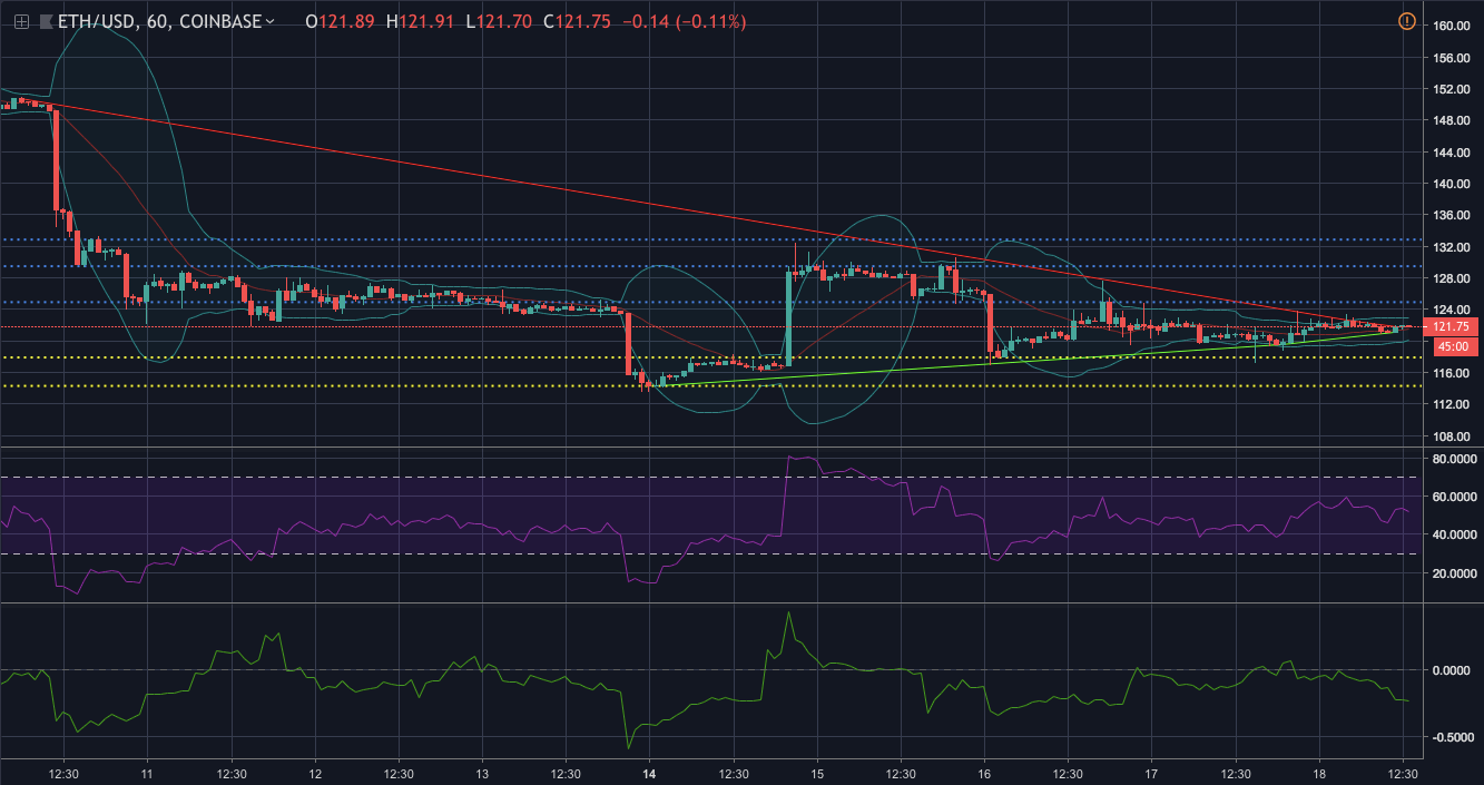 In the one-hour chart, the cryptocurrency demonstrates a downtrend from $150.73 to $122.53 and from $122.53 to $121.84. The uptrend for the coin was recorded from $114.35 to $119.57 and from $119.57 to $121.11. The immediate resistance for the coin is placed at $124.93 and the strong resistance is found at $129.49. On the contrary, the immediate support has found its ground at $117.92 and the strong support is at $114.31.