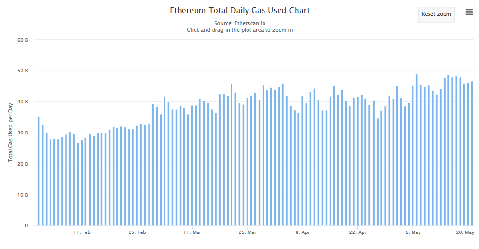 Source: Etherscan.ioFurther, it was also reported that the total daily Gas utilized on the ETH network had exhibited a significant increase. On Feb 21st, the total Gas consumed on the ETH network was around 32 billion, while the Gas utilization was at 46 billion on 21st May.