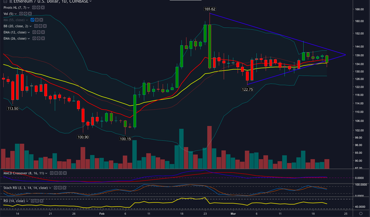 ETH price 00 has been locked in a tightening range with resistance at $138, $140 and $142, and today’s hiccup pulled ETH below a strong support at $135.