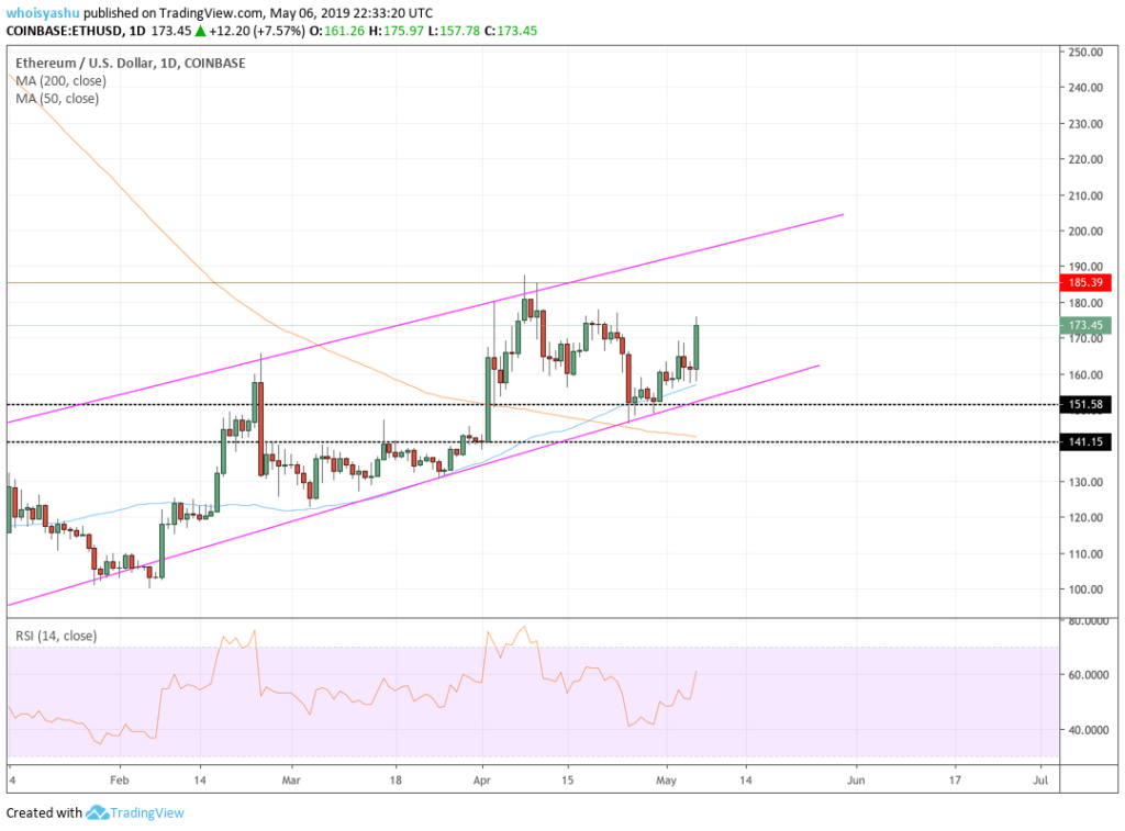 The Ethereum price has established support at its 50-period moving average (indicated via blue) which is maintaining the asset’s overall bullish bias. The price could face resistance in $177-180 area as it tests $185.39 as its upside target. A break above either of these areas would expose Ethereum’s upside to the parallel channel resistance (indicated via pink). At the same time, the price could also attempt a pullback action at any of those resistance levels, which would open decent short opportunities toward the 50-period MA.