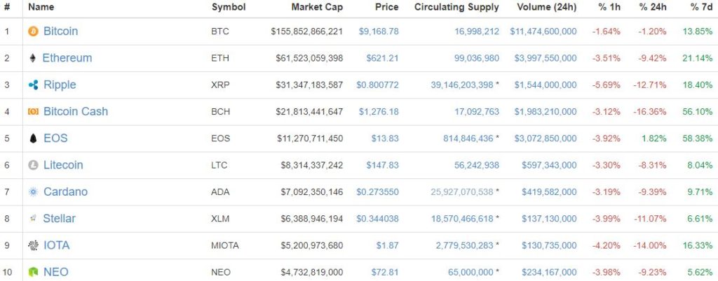 Indeed, the bitcoin price declined just one percent for the day, beating the index by more than eight percent and raising its market share back above 39 percent. bitcoin is now trading at a global average of $9,168.