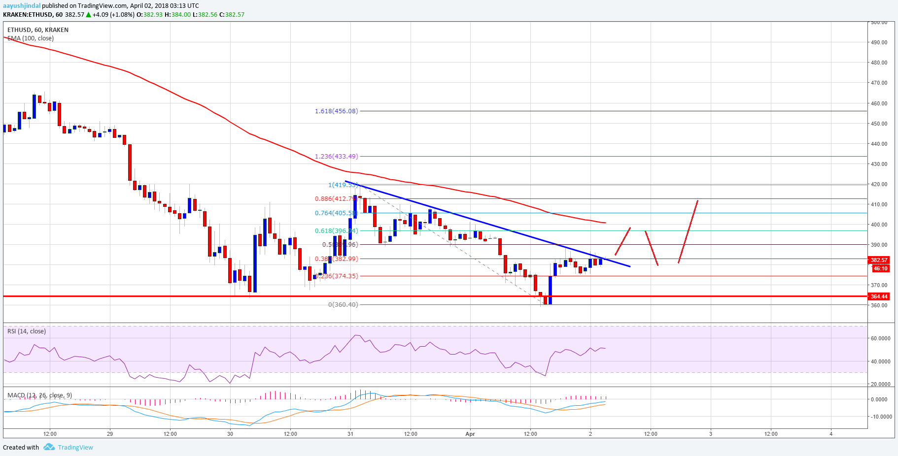 There as ETH price declined below the $380 and $360 support levels against the US Dollar. The price traded to a new low around the $355 level before starting an upside correction. It moved above the 23.6% Fib retracement level of the last downside move from the $419 high to $360 low. However, there are many barriers on the upside near the $385 and $390 levels.