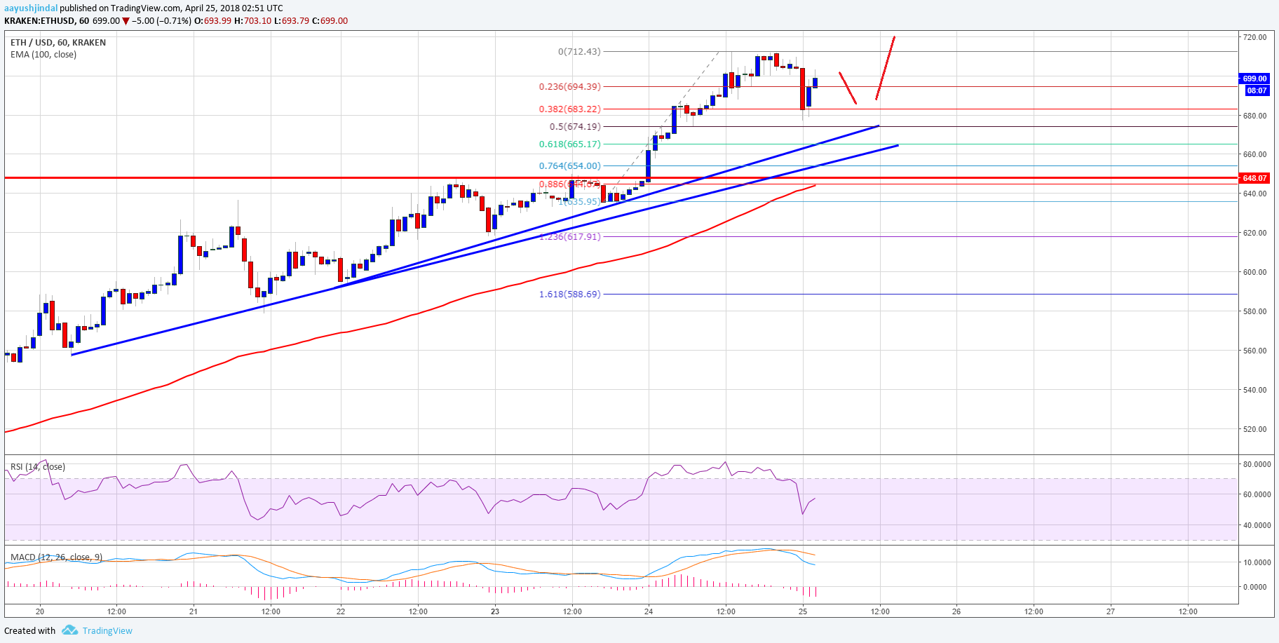 - ETH price corrected lower after trading as high as $712.43 against the US Dollar.