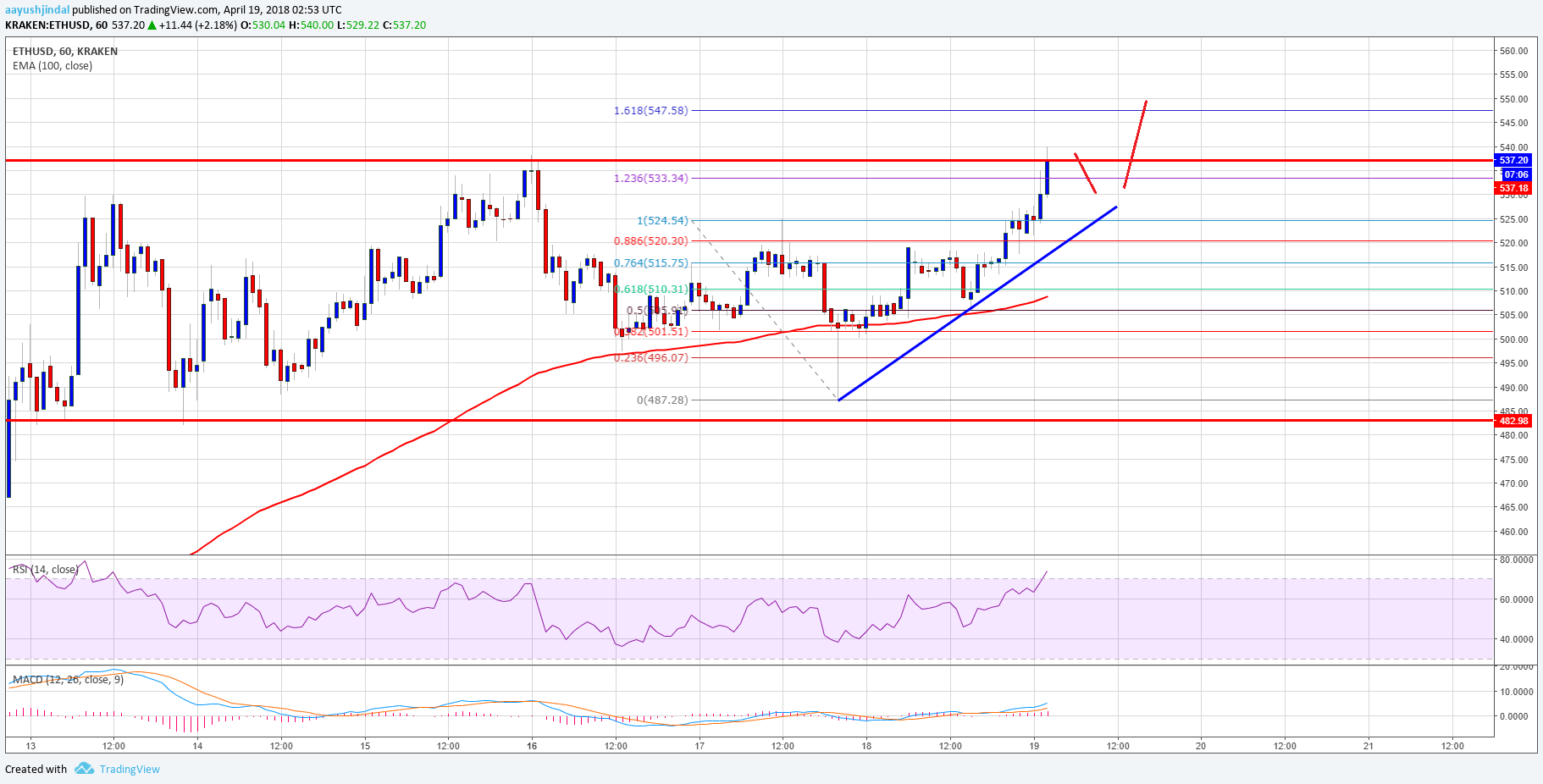 There was a base formed around the $510 level in ETH price against the US Dollar. The price consolidated for some time before it started an upside move from the $511 swing low. The 100 hourly simple moving average (currently at $508) acted as a major catalyst for an upside move. Buyers succeeded in pushing the price above the $530 resistance area.