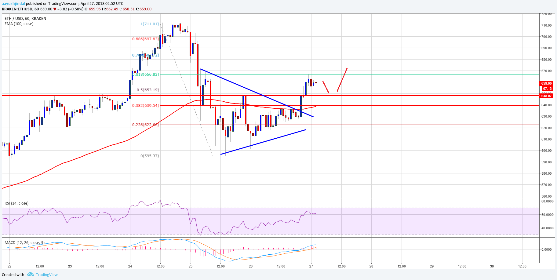 - There was a break above a consolidation triangle pattern at $632 on the hourly chart of ETH/USD (data feed via Kraken).