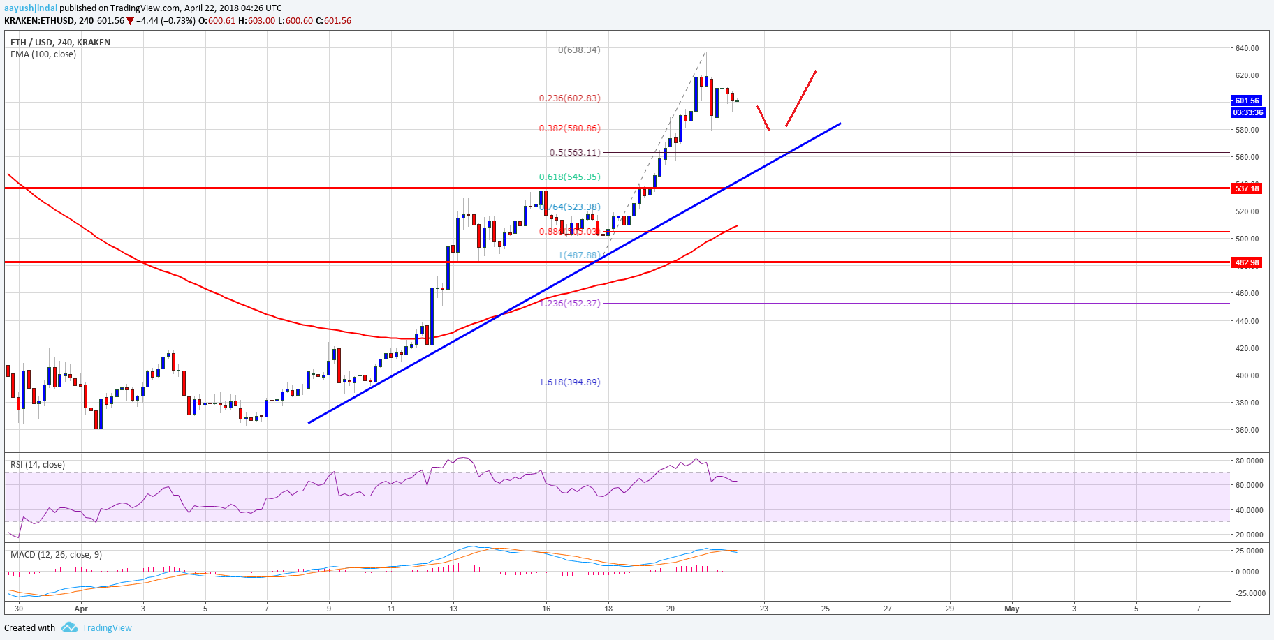 This past week, there was a from well below $500 in ETH price against the US Dollar. The price surged higher and it was able to break many resistances such as $550, $580 and $600. It traded as high as $638 before it faced selling interest. A short-term downside correction is underway and the price has moved below the 23.6% Fib retracement level of the last wave from the $487 low to $838 high.