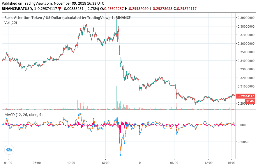 BAT, which runs on as an ERC-20 token, fell more than 18 percent for the day. The majority of that movement occurred late last night, shortly after the BAT price peaked at $0.39 on Binance. The token has shed nearly one-quarter of its value since then and is currently priced just below $0.30, which translates into a market cap of $298 million.