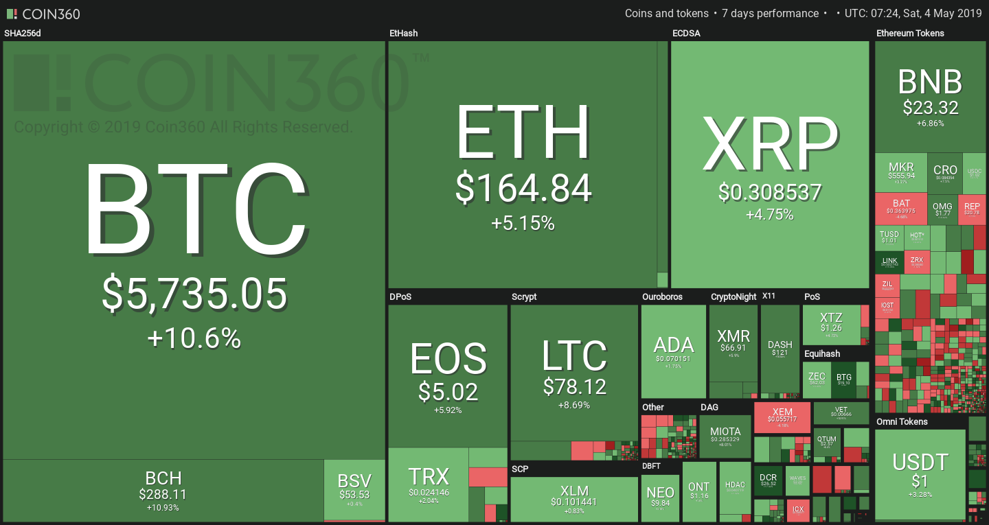 Over several hours on May 3, the price of spiked from around $5,300 to over $5,700 in major markets, allowing the crypto market to gain more than $7 billion in a single day.