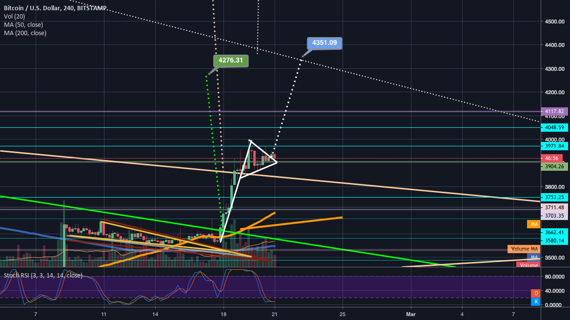 If we can break up from bitcoin’s current 4hr , the breakout target shown here is around 4350 or so….which would also allow us to hit the green falling breakout target shown here as well. Much more important than either of those targets however is if we can at least get enough momentum from a break of the to lift price action above the lavender horizontal at $4117. Why is this line so pivotal? Because if we can reach above it we will for the first time since near the beginning of the bear market form our first higher high on the 1 day chart. That would signal that we may finally be starting to see exchange in the overall market trend from to at the very least more sideways…we could of course hit that higher high and still follow it up with a lower low if the rejection at the top descending dotted white is powerful enough…if we were to then follow it up with a 1 day lower low, that would almost certainly become our capitulation candle(unless we already had capitulation back in late December at 3.1k). Also if we were to follow the daily higher higher with a lower low, even though bears would then still be in control we would very likely have another higher high after that lower low since it would likely be a bounce up from capitulation and from there we could expect a higher low and a subsequent higher high after the higher low on the daily. Once we can complete a consecutive higher high/higher low/higher high sequence on the I will then be confident the bottom is indeed in. However we could also bart down here instead of breaking up from the and simply continue our never ending bearmarket series of lower highs on the 1 day chart….if so the bottom may not be in for some time. So for now though this is a very pivotal moment for …especially if we can break up from the current 4hr bullpennant. 4hr stochrsi looks like it wants to go up but the daily stochrsi looks like it wants to head downward so who knows it could break up hit the target and then have a big retracement…if so as long as the breakup goes above 4117 that will be a very very good sign…even if we capitulate immediately after.